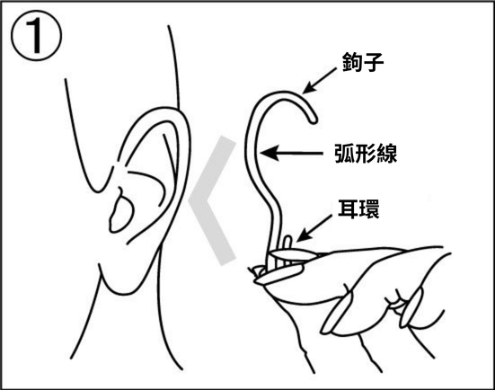 2. 先將上方的鉤環套入耳朵。